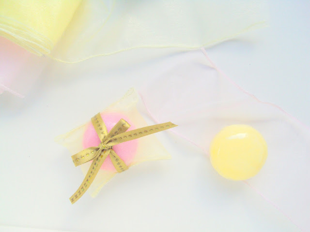Gostei muito do resultado, até porque a ideia das fitas surgiu bem por acaso. Queria algo transparente mas só dispunha de organza branca. Na hora que olhei as fitas largas exatamente nos tons dos sabonetes, não tive dúvidas! Elas fariam as vezes de tecido. Laços e um pingente arrematam os pacotinhos.